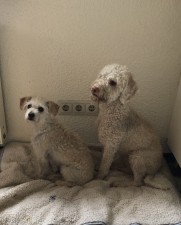 Our two female dogs, Luna and Bijou, are fed a mix of natural flakes and wet food. We change the wet food every two days. The flakes are weighed out and hot water is poured over them before they go for a walk. Back from the walk, the flakes have swollen and cooled down. We add the wet food, mix everything together and the dog meals are ready. The picture shows the two of them waiting on the blanket in the kitchen while the food is being prepared.